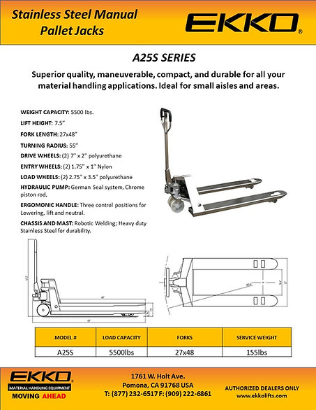 The EKKO A25S Stainless Steel Manual Pallet Jack is built for durability and reliability in the most demanding environments. Crafted with high-quality materials and precision components, every unit is robotically welded for consistent performance. Ideal for loading and unloading trucks, stock rooms, loading docks, manufacturing floors, and warehouses, this pallet jack is designed to withstand the toughest conditions.