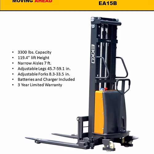 EKKO EA15B Semi-Electric Straddle Stacker 3300lbs. Cap., 119.4″ Height