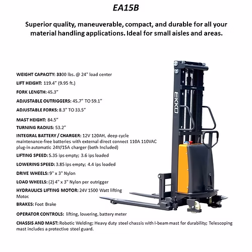 The EKKO EA15B Semi-Electric Straddle Stacker is designed with the combination of the versatility of forklift and a pallet stacker. It is ideal for loading and unloading trucks, loading docks, stock rooms, manufacturing floors and warehousing.