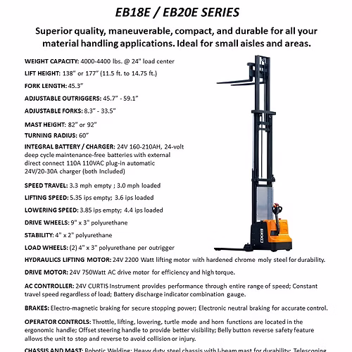 The EKKO EB18E Electric Straddle Stacker is designed with the combination of the versatility of a forklift, reach truck and a walkie stacker. It is ideal for loading and unloading trucks, loading docks, stock rooms, manufacturing floors and warehousing.