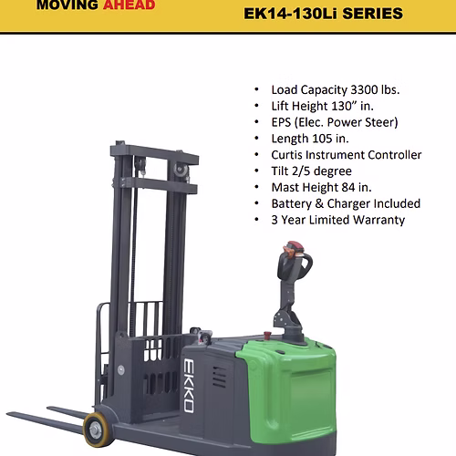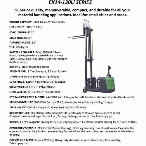 The EKKO EK14-130Li Lithium Powered Counterbalanced Walkie Stacker is designed with the combination of the versatility of forklift and a walkie stacker. It is ideal for loading and unloading trucks, loading docks, stock rooms, manufacturing floors and warehousing.